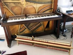 やっと調律です。彼は古い楽器なので、調律用のハンマーも形が違います。残念ながら、ピッチがものすごく下がっていましたので、とても注意が必要です。チャーレンさんは、お歳を召していますので、これから維持保存ができるようにメンテナンスしていきます。